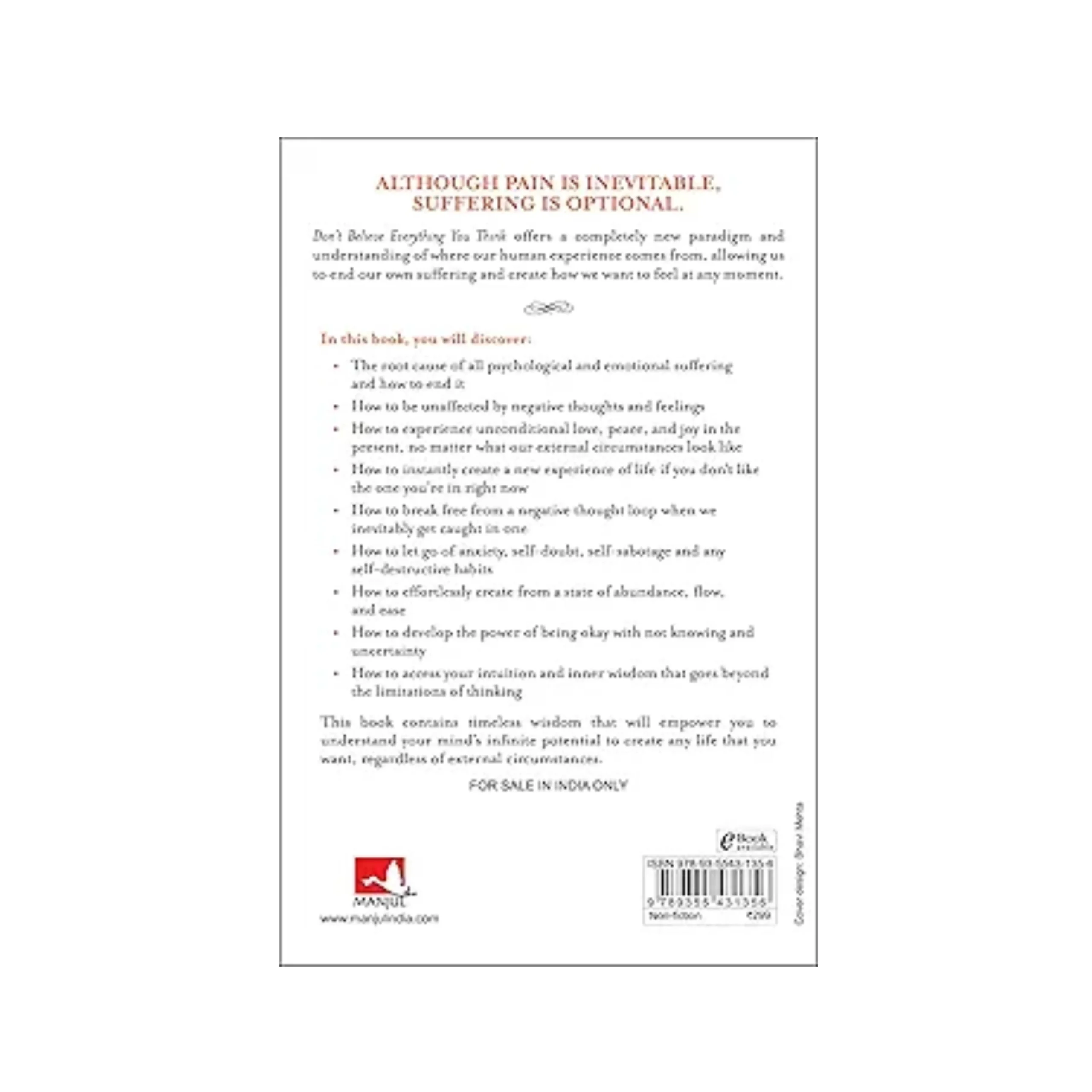 Discover how to conquer anxiety, self-doubt, and self-sabotage without depending on motivation or willpower. ‘Don’t Believe Everything You Think’ uncovers the core of psychological suffering and offers insights to effortlessly shape the life you crave. Learn to detach from negativity, embrace love and joy, escape negative thought cycles, and tap into inner wisdom. The message is clear: anyone can attain peace, love, and fulfillment, irrespective of their history. It’s not about rewiring your brain, but expanding your consciousness for lasting transformation. Within this book, delve into the core of emotional suffering and receive insights on effortlessly curating the life you aspire to.